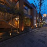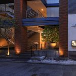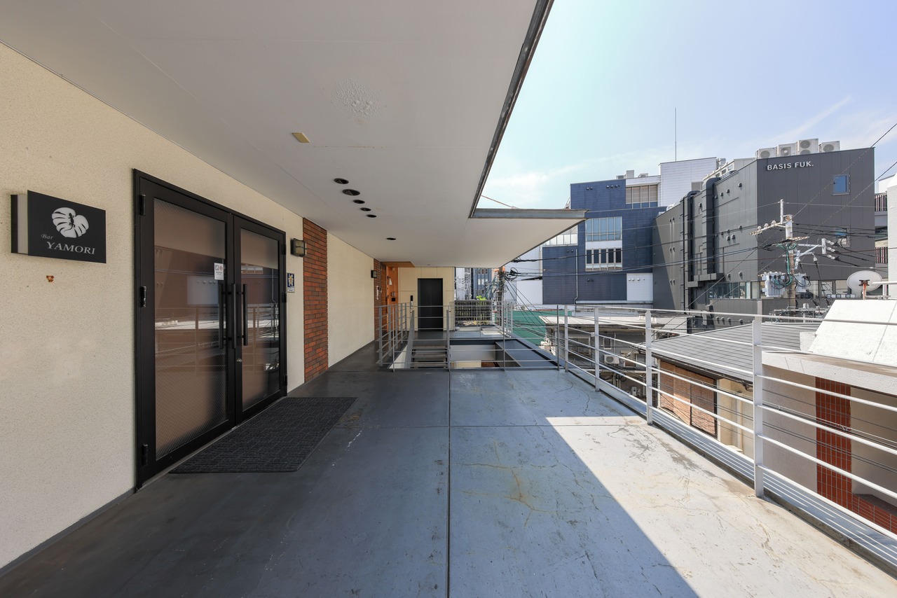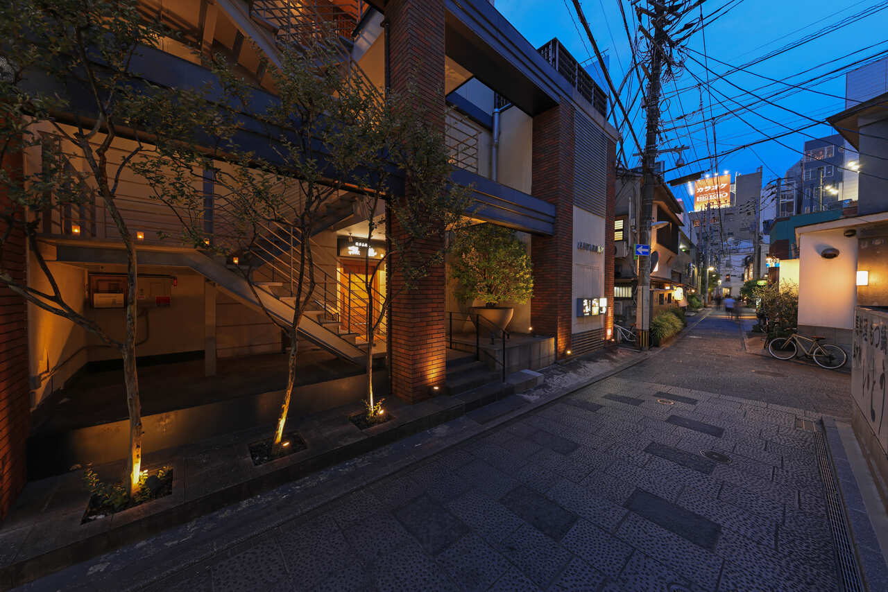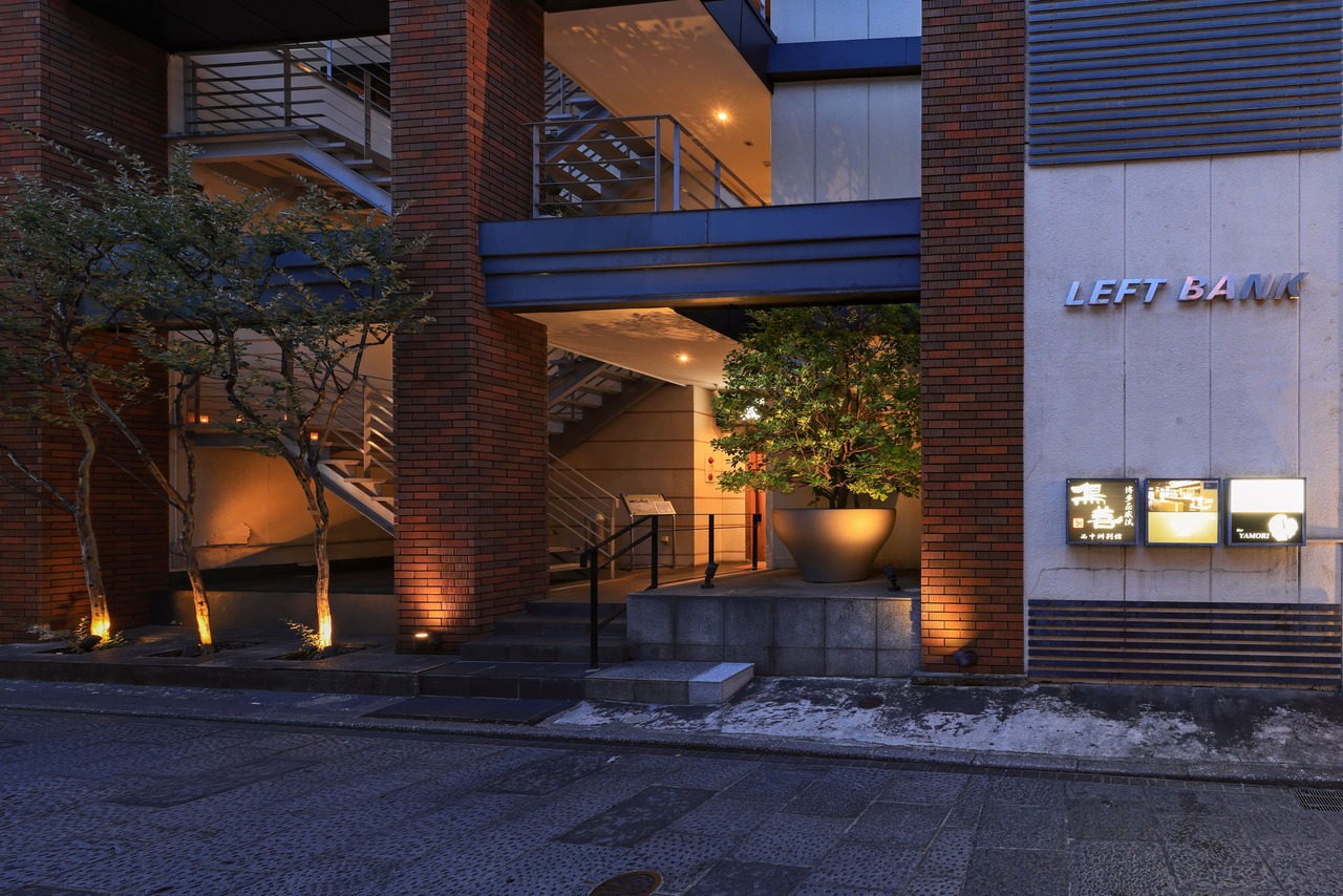 福博であい橋、天神中央公園から西中洲に入り、京都石畳の様な小道を歩いていると、左側に赤レンガのビルが見えてくる。外壁とおしゃれに配置された階段のファサードが特徴的で、間接照明を多く配置し、落ち着いた雰囲気を醸し出している。