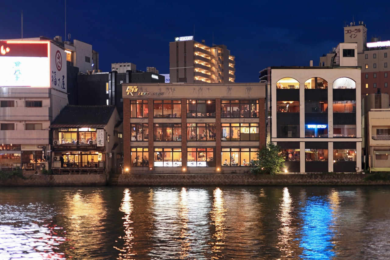 立地する西中洲は隣接の中洲エリアと異なり、大人の隠れ家と言われる佇まいとロケーションで、シニアサラリーマンや会社経営者などが集うエリアである。高級な飲食店が多く立ち並び、特に川沿いからは那珂川や対岸の中洲エリアの賑わいなど特別感ある光景に触れることが出来る。