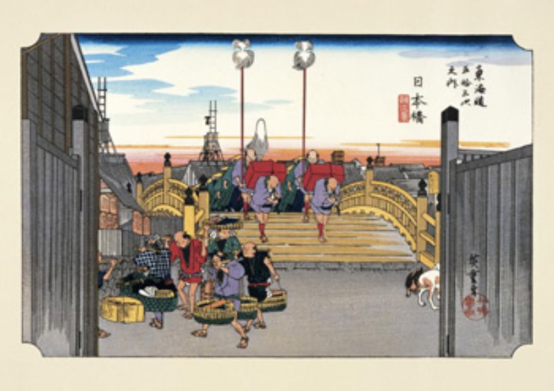 日本橋は五街道の起点であるが、当時は魚市場があったようだ。広重の絵には解放された大きな木戸の向こうから大名行列が。街道あるあるだが日本橋には左手に高札場、右手に晒し場になっていた。右下の犬の居る辺りがその場となっている。