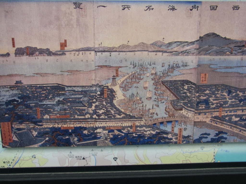 旧地図、小倉城、城下、常夜燈が見える。対岸には長門の国、萩の表示もある。