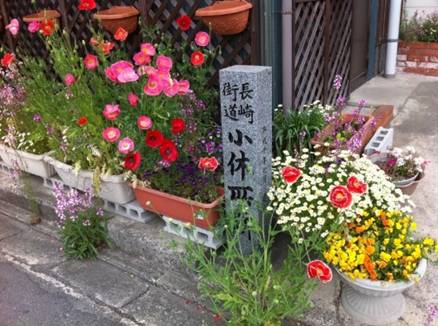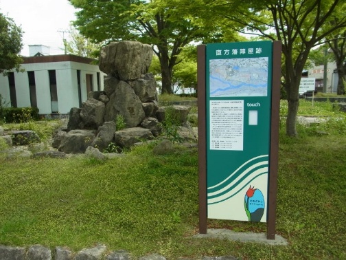 写真撮っていたら家の2階から「こらっ!」と声がして、見上げたら笑顔で(笑)、趣の有る町屋が切れる辺り、小公園があり、直方陣屋跡の道標が。ここは黒田長政の四男から四代続いた城下町である。