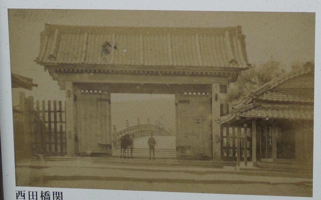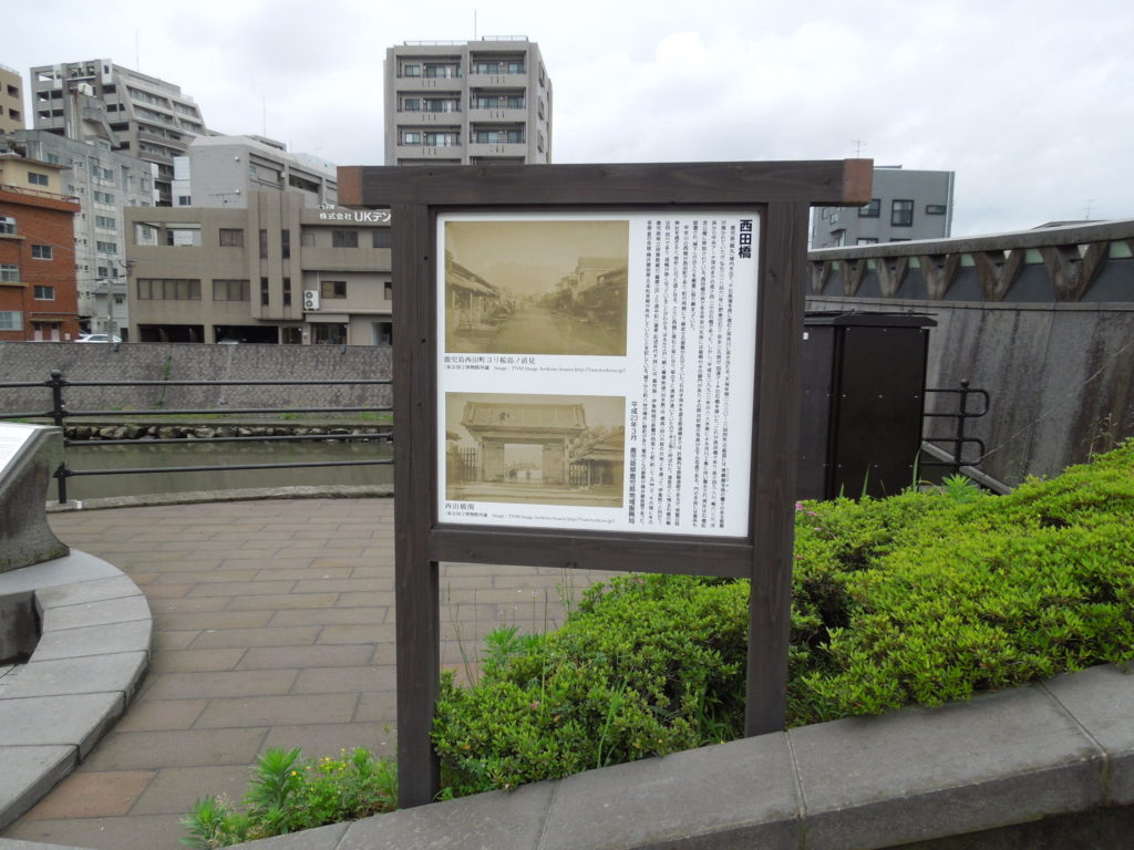西田橋へ着いて甲突川を渡って遺構をチェックし、ここが薩摩街道の起点というエビデンスを期待したがオフィシャルなものが無く、御門があったなどの解説板しかなかった。