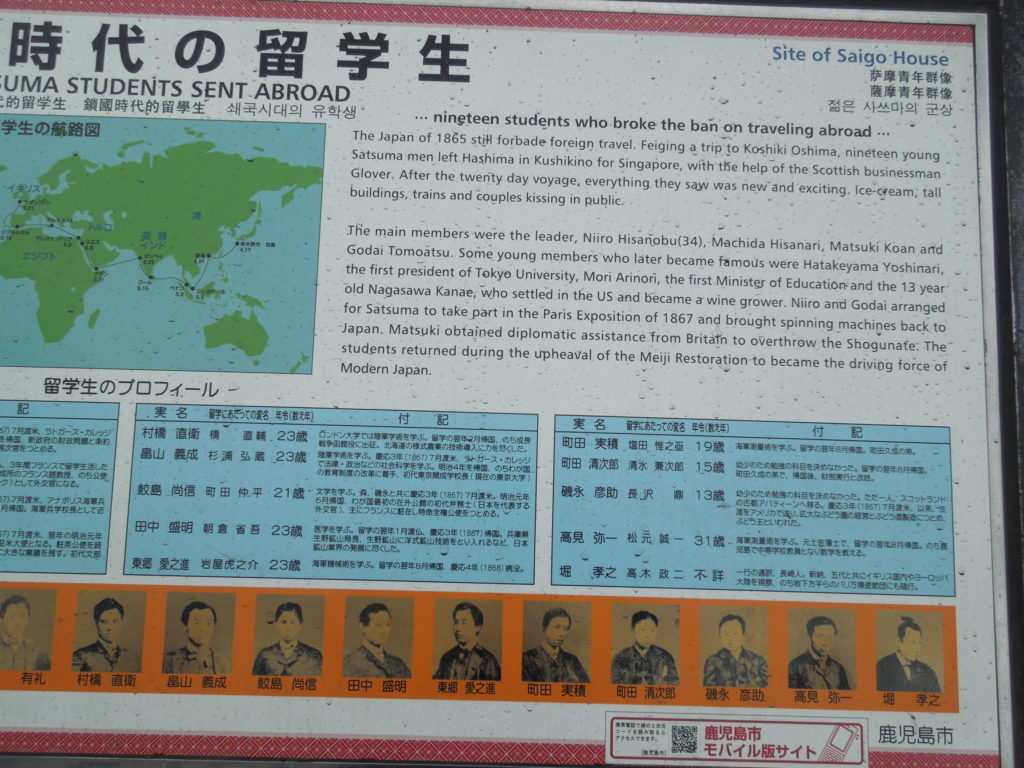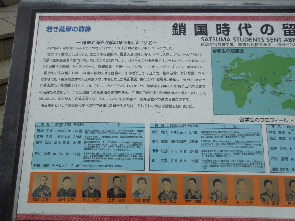 ところが、やや決めつけ過ぎたか、駅前に出て見えたのは高い塔屋状のオブジェにブロンズ人物像が登っているのか、休んでいるのか、群れているナニコレ珍光景。あまりの意外さで思わず近づいてみると、「若き薩摩の群像」と解説プレートがあった。何の意味があるのかと思い、この解説(略歴がすごい)を見て、ここに設置されている理由に納得した。さすが教育県に相応しい、鹿児島県人の誇りのなせる技と感じた次第。