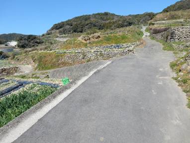 もうそこに農道が見える位置まで、かなり登ってきたところで12時半過ぎとなった。海側に振り返ってみると加津佐の海を一望出来てしばし留まってしまう。そこで石垣の上に腰掛け、野菜ジュースとあつみパンのトマト茄子ベーコンのヘルシーフォカッチャ(長~い商品名で記憶も?)を食べる。気持ちよく爽快だ。