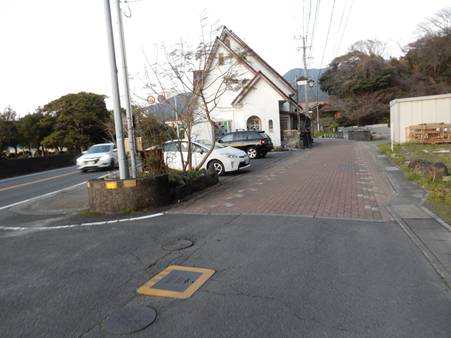 加津佐海水浴場前に着いて、国道から右折し山側に入るとすぐ右手に温泉神社の鳥居、前は昭和を思わせる雰囲気の旧加津佐商店街が続き、進んで行くと、JAバンクの建物に突き当たり、右手斜めに進む。